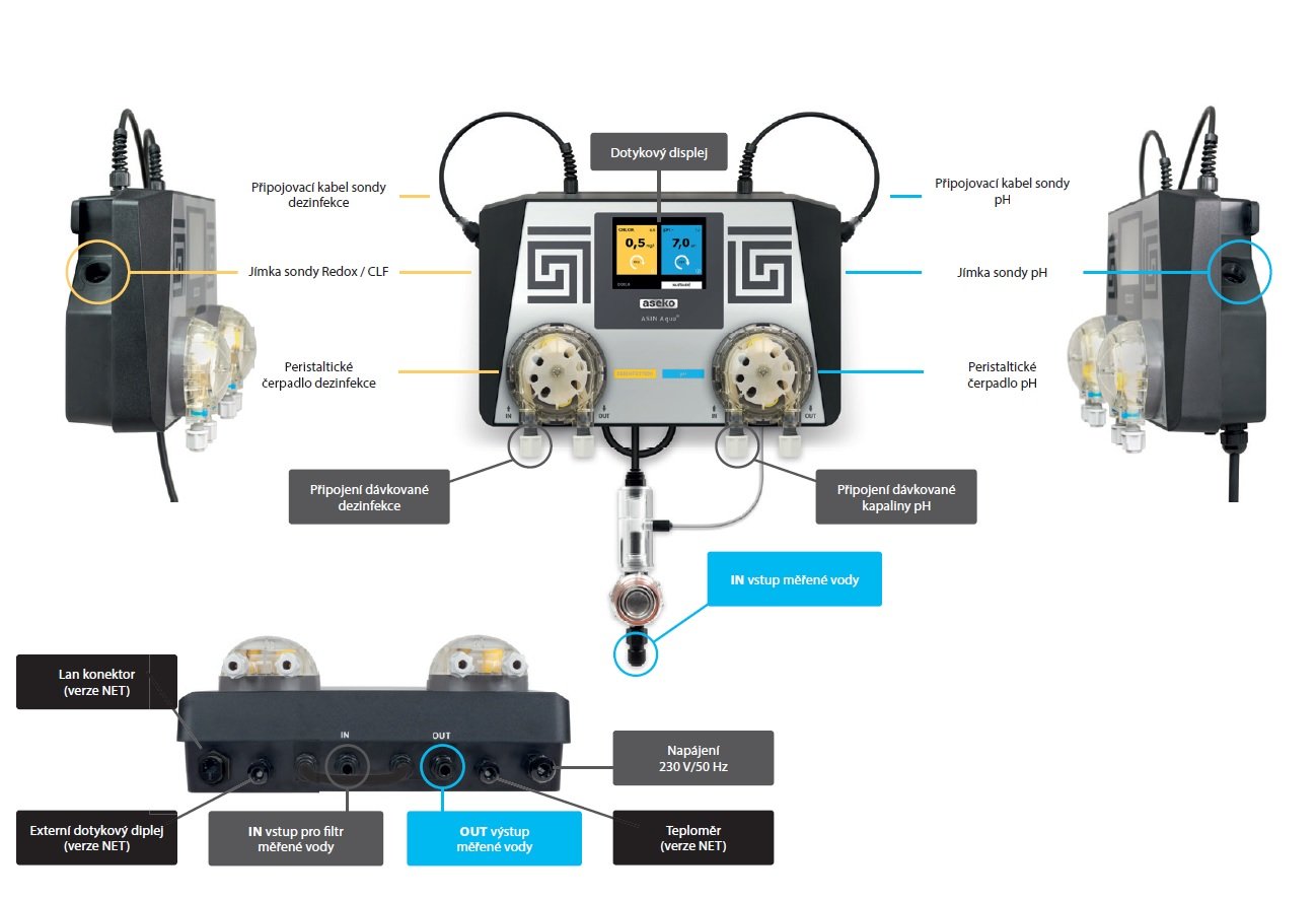 měření a dávkování dezinfekce a pH. Jeden automat s