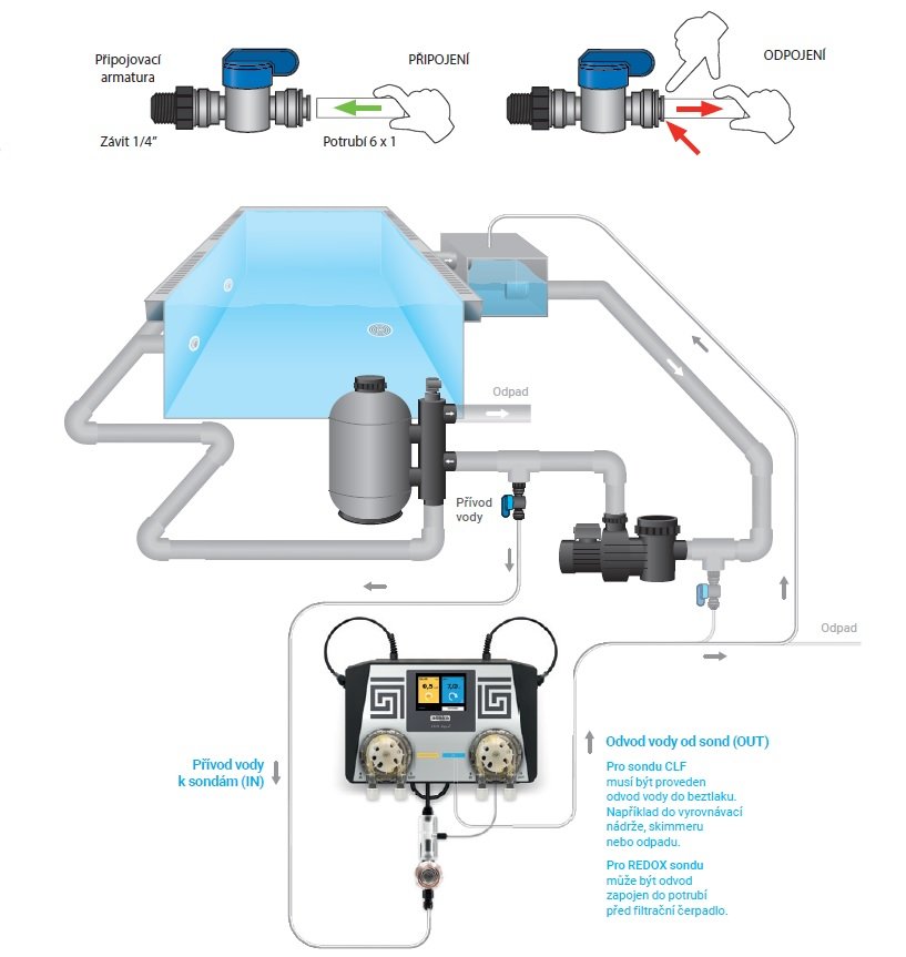 měření a dávkování dezinfekce a pH. Jeden automat s